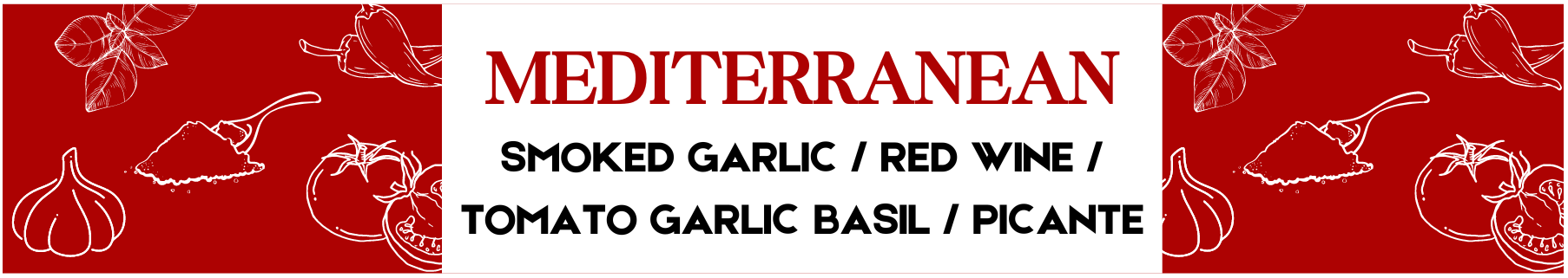 - Mediterranean : Smoked Garlic, Tomato Garlic Basil, Red Wine, Picante